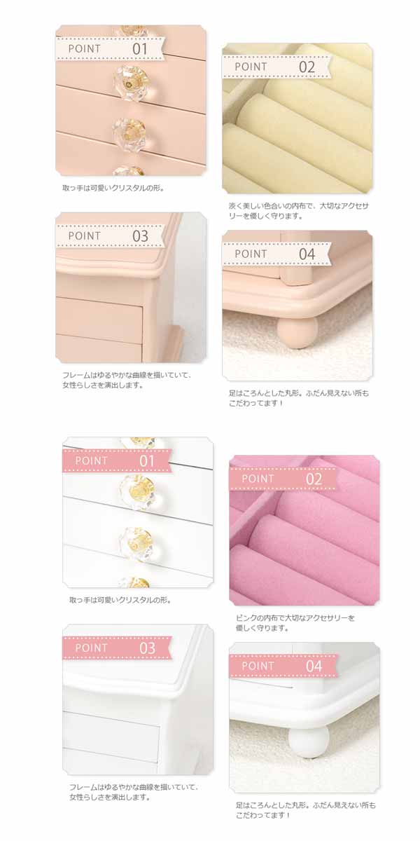 ○カラー:ピンク(PI)、ホワイト(WH) ○サイズ:(約)幅26×奥行16.5×高さ28cm ■ 引出内寸:(約)幅21×奥行12×深さ2cm ■ 1マスサイズ(天板オープン部 フリースペース):(約)幅7×奥行6×深さ2cm ■ 1マスサイズ(引出 6分割):(約)幅3×奥行12×深さ2cm ■ 1マスサイズ(引出 15分割):(約)幅3×奥行4×深さ2cm ■ 1マスサイズ(引出 フリー):(約)幅21×奥行12×深さ2cm ○素材:主材:MDF 塗装:ラッカー塗装 ■送料 送料無料(北海道・沖縄・離島は別途送料がかかります) ※日時指定(時間帯指定は午前か午後のみ) ※実物とは微妙に色が異なる場合がございます。